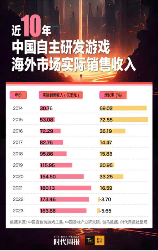 據(jù)中國(guó)音數(shù)協(xié)游戲工委、中國(guó)游戲產(chǎn)業(yè)研究院、伽馬數(shù)據(jù)共同發(fā)布的數(shù)據(jù)顯示,中國(guó)自主研發(fā)游戲在海外市場(chǎng)的實(shí)際銷售收入已從2014年的30.76億美元增長(zhǎng)至2023年的163.66億美元,十年間增長(zhǎng)了4.32倍。